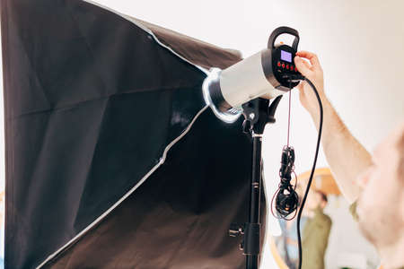 Asian photographers are adjusting the brightness of lights for shooting fashion models in the studio.