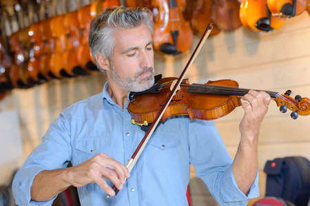 Adult man is playing a violin, in dark ambiance, showing emotions and expressions.
