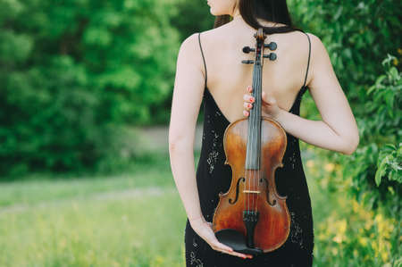 Beautiful girl with a violin on nature. long hair. the violin is pressed to the back