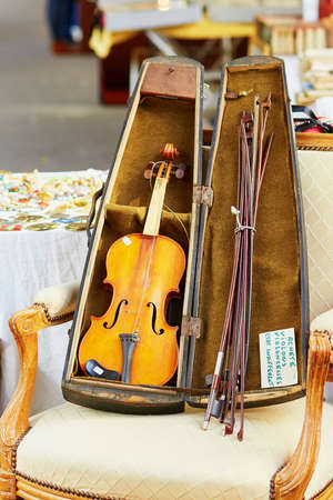 Old violin in opened case. String musical instrument in velvet case. Classic musical instrument.