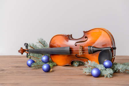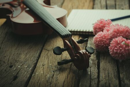 Close-up shot violin orchestra instrumental with vintage tone processed over wooden background select focus shallow depth of field