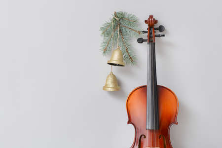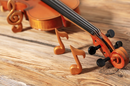 Close up detail on violin body, bow and music notes background. Classic instrument with copy space area