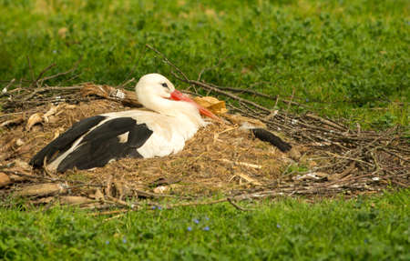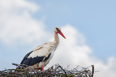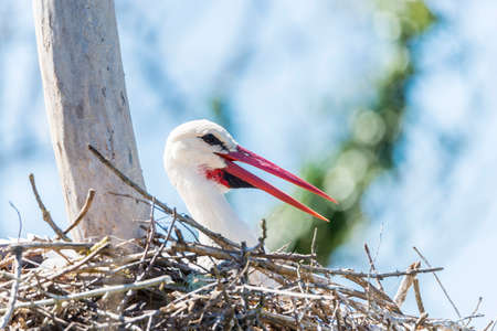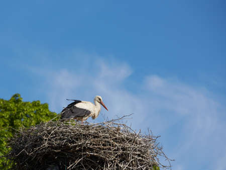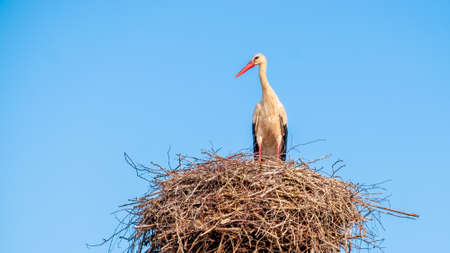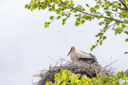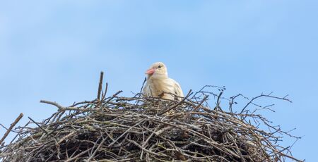 White stork (Ciconia ciconia) a large wading bird with black and white plumage sits high in the nest.