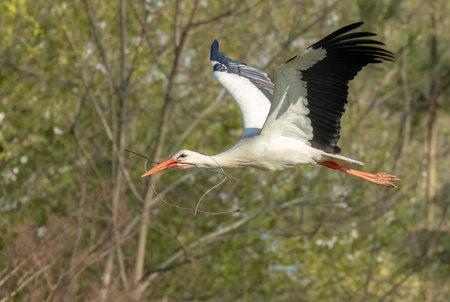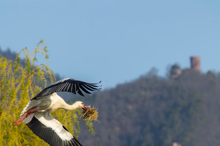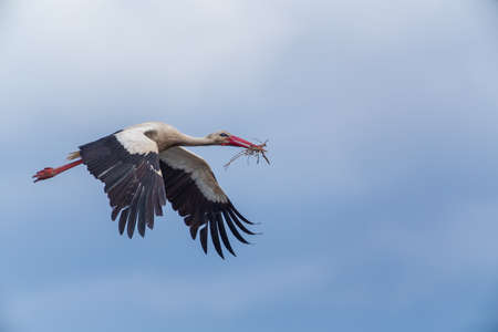 White stork with a nest in its beak flies across the blue sky