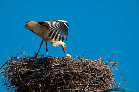 A stork in its nest bringing food for the newly born storks