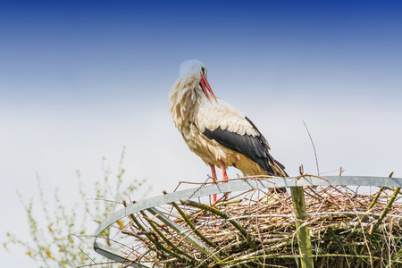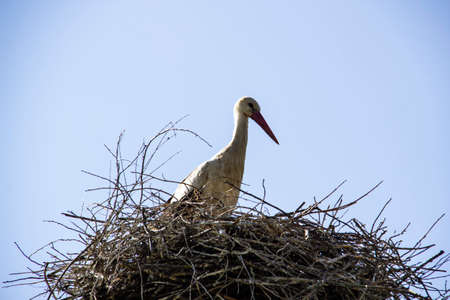 European white stork, ciconia, standing in the nest by day