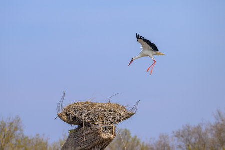 A White Stork approaching a nest on the roof of a hut, sunny day in springtime in Camargue (Provence, France)