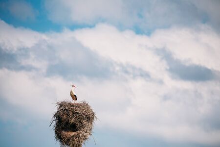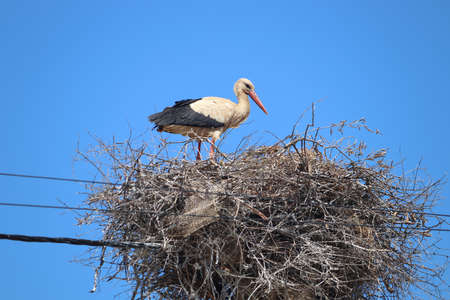 Stork on nest against blue sky. White stork living in village in Ukraine. The Nest of stork in the wild nature.