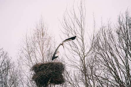A stork is late in the winter high in the nest, waiting for its partner to start hatching eggs again in the spring, photo tasks in Fortmond on the IJssel rain river