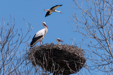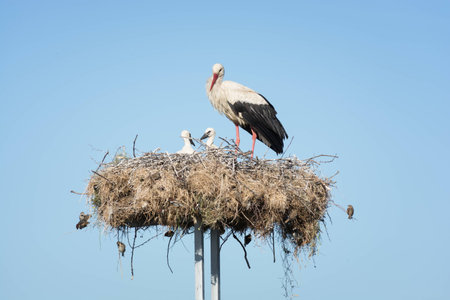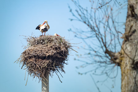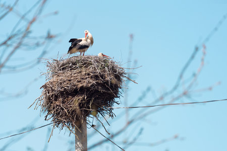 Early spring scene. Storks in a nest with a blue sky in the background.