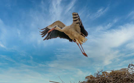A stork in its nest at a cold but sunny day in winter with beautiful clouds next to Büttelborn in Hesse, Germany. Starting from the nest to fly away.