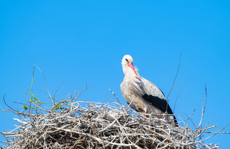 White stork watching from a large stick nest built high against a clear blue sky, illustrating wildlife and nature conservation