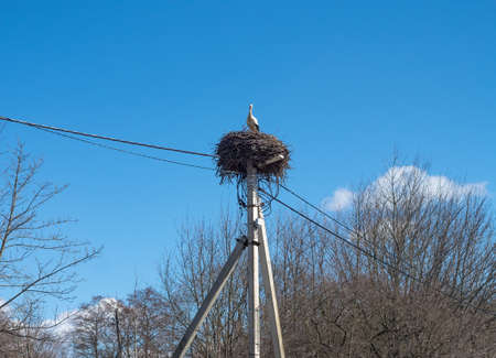 A stork in the nest. Storks arrived in the spring. Stork's nest on a pole. High voltage pole and bird's nest.