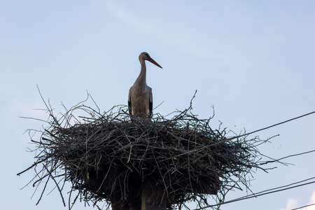 Bottom view of a white stork in a nest on a pillar. An adult stork guards his family, his cubs, his chicks in a large nest of branches.
