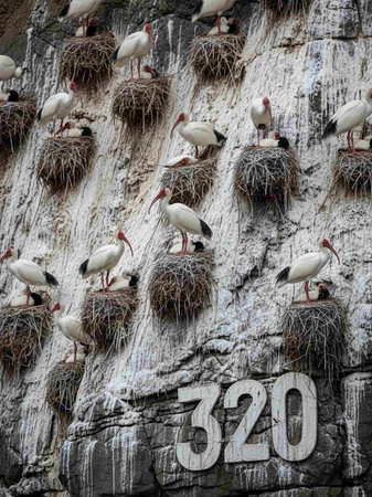A flock of white ibis in the nest on the cliff.