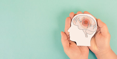 Holding a head in the hands, epilepsy disorder awareness, brain waves, mental health care, paper cut out