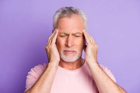 Photo of retired grandpa palms head closed eyes annoyed face wear pink t-shirt isolated purple color background