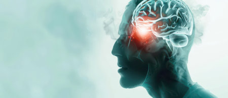 The image shows a profile view of a person's head. The brain is translucent and visible through the skull, with a red glow coming from the middle of the brain. There is smoke behind the head. The background is a soft, light blue.