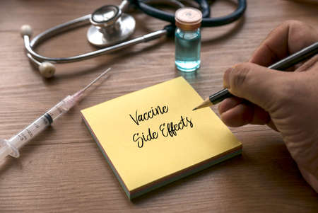 A bottle of vaccine, syringe, stethoscope and a hand writing on yellow memo note written with Vaccine Side Effects on wooden background.