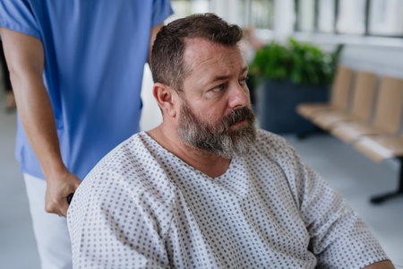 Male nurse pushing a patient in a wheelchair along a hospital corridor. Overweight patient feeling anxious and has health concerns.
