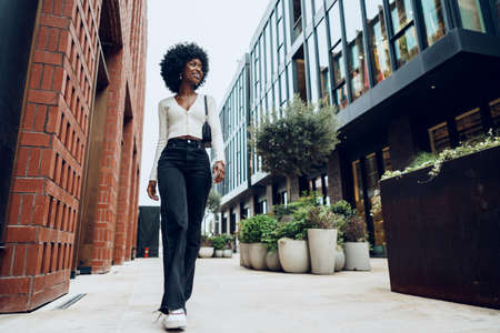 Portrait of attractive young woman walking outside in the city