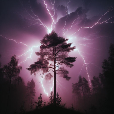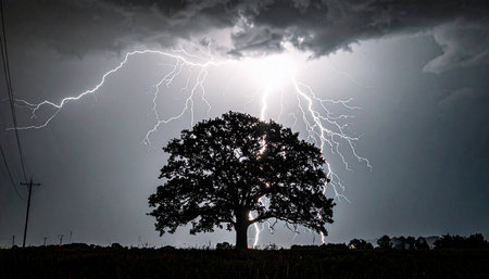 Oak tree struck by lightning during storm, illuminated branches against dark sky, no humans.