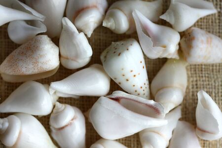 Top view close up of mollusk. Sea mollusks close-up. Background from exotic shells. Texture of shells top view. Concept group of sea shells. Seashells background.