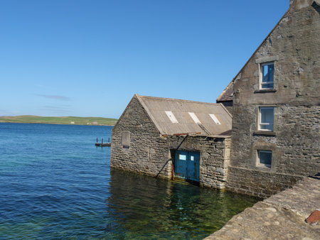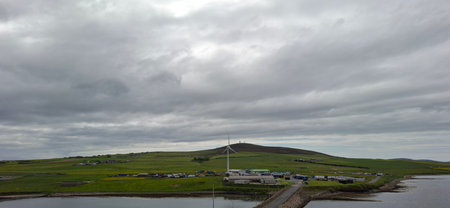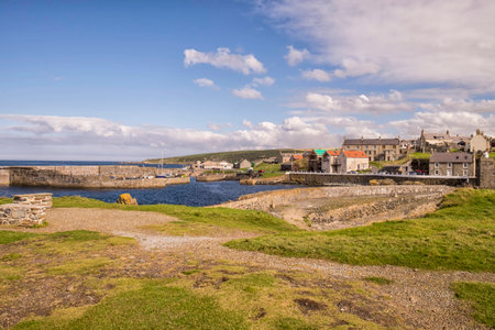 Orkneys, Scotland - June 5, 2012: Shore at Burwick village on South Ronaldsay Island. Small fishing vessel and a farm front the wider green landscape under cloudy sky.