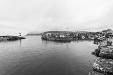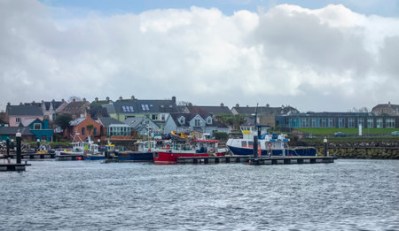Howth, Ireland - January 1, 2020: Fishing ships in the small trading port of Howth, fishing village near Dublin, Ireland