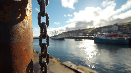 A close-up of rusty chains, each link interlaced with the coastal harbor in the background, boats floating on the sea, a blue sky and white clouds, sunlight shining through the clouds, creating a warm atmosphere. The composition focuses on details such as rusted textures, chains, ocean waves, distant ships, and people walking along the marine walkways. This photo highlights the natural scenery, water elements, urban life, architecture, and travel culture. --chaos 30 --ar 16:9 --v 6.1 Job ID: 79644a56-08d5-4e95-9738-d5f389523dbb