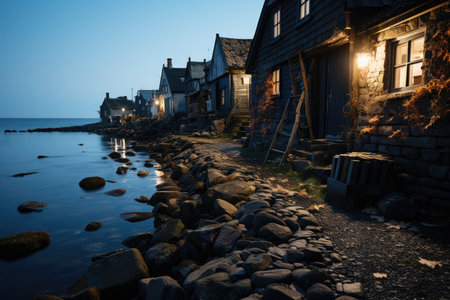 Fishermen village bathed by the moonlight, windows reflect the serene sea., generative AI