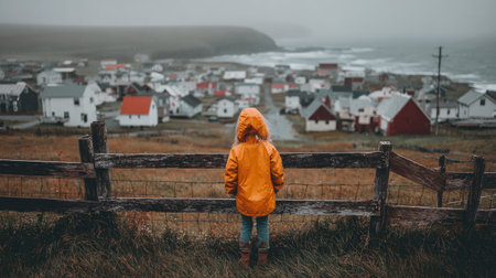 A little girl in a yellow raincoat stands at the edge of a wooden fence against the background of a village in Iceland.