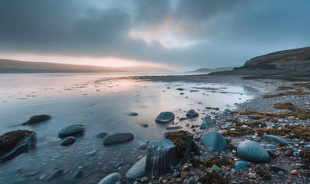 A serene coastal landscape with soft morning hues illuminating the shoreline