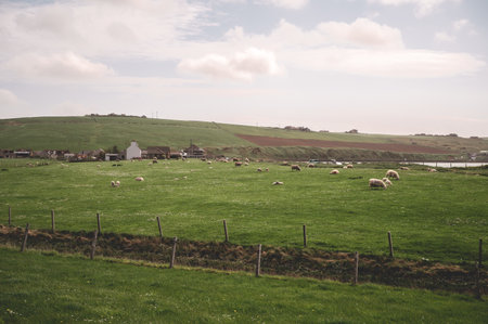Group of sheep's grazing on a meadow next to the sea at the countryside of Kirkwall, Scotland
