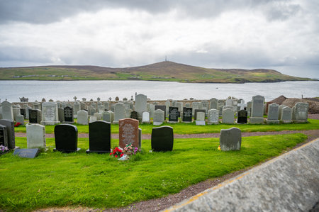 Graveyard Cemetery on Shetland Island on a hill with sea in the background during cloudy day