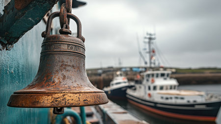 A close-up view of a rusty ship bell, capturing maritime history against a backdrop of moored fishing boats and an overcast sky.