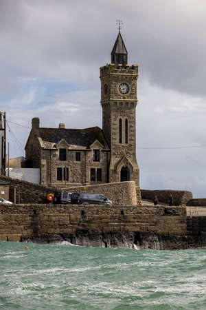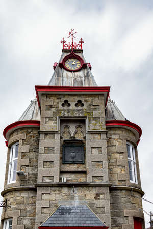 PORTHLEVEN, CORNWALL, UK - MAY 11 : Clock tower of the Bickford-Smith Institute in Porthleven, Cornwall on May 11, 2021. Two unidentified people