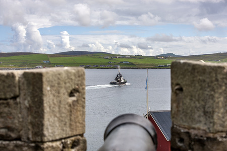 Bressay Island viewed from Fort Charlotte Lerwick, Shetland, Scotland, United Kingdom. View from the embrasure for the cannon