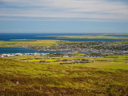 Panoramic view of Kirkwall, Mainland, Orkney from the top of Wideford Hill on a sunny day