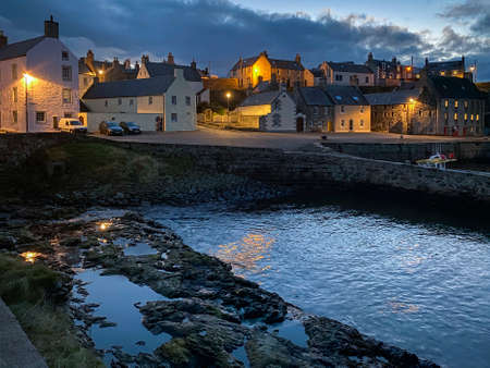 Dusk over the 18th century harbor at Portsoy, a small coastal town on the Aberdeenshire, Scotland.