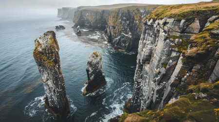 An aerial perspective showcasing rugged cliffs along the coastline meeting the vast expanse of the ocean below.