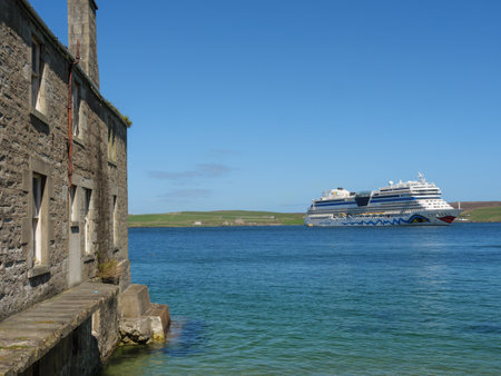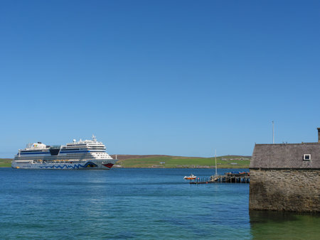 AIDA Bella at Shetland Islands during cloudy day, view from the distance with village in front