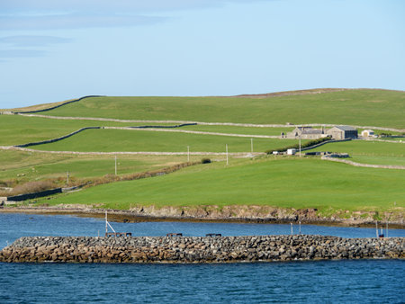 View of countryside and coast in the island of South Ronaldsay, Orkney Islands, Scotland, UK