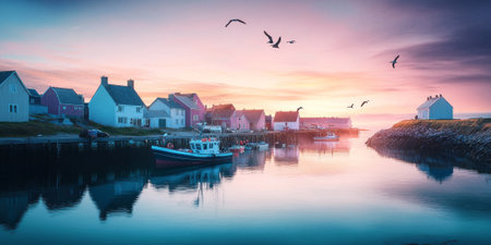 A serene coastal town at sunrise with fishing boats in the harbor, pastel-colored houses along the shore, and gulls flying overhead. The peaceful scene captures maritime charm.