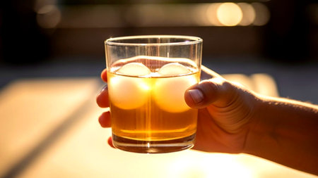 A hand holding a glass of whiskey with ice cubes, illuminated by warm sunlight, creating a serene and inviting atmosphere.