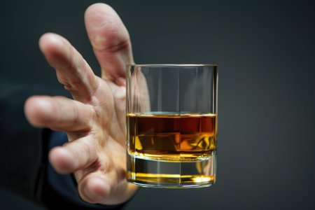 Man refusing to drink whiskey indoors, closeup. alcohol treatment addiction
