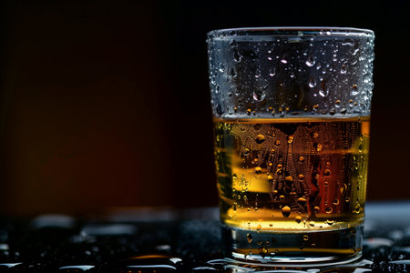 Glass of liquor is sitting on bar counter top. Generative AI.
