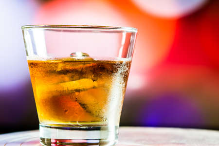 Glass of aged golden whiskey with ice cubes on the table. Amber colored alcohol beverage with rocks at the bar
