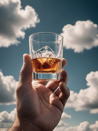 Photo Of Male Hand Holding A Shot Of Alcohol Drink And Clouds, Retro Engraving Style, Vintage Design Element, Raster Illustration. Generative AI
