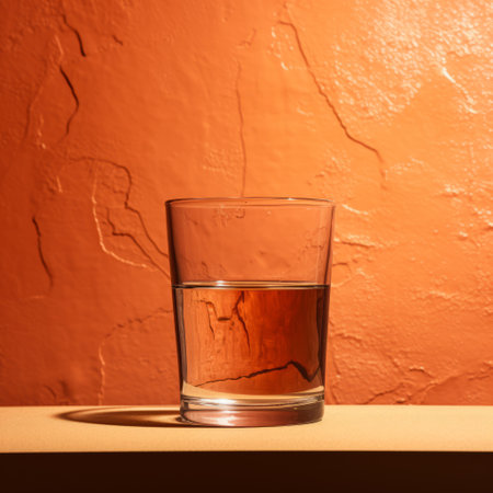 glass of whisky on a table in the style of color field minimalism, with a juxtaposition of light and shadow. the new york city subject matter adds a unique touch to the terracotta hues and luminosity of the water. the cracked, light pink and orange tones create a captivating visual experience. ai generated